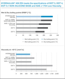 Enhanced safety is also provided by the product’s higher boiling points and its reduced low temperature viscosity. HYDRAULAN® 406 ESI is a brake fluid that covers all the specifications of DOT 3, DOT 4, DOT 5.1 NONSILICONE BASE and SAE J 1704 Low Viscosity.